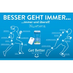 Bluetens is a medical device, which works with the technology of electro-muscle-stimulation (EMS). You get access to several individual treatments, which have been developed by medical specialists for improving your daily well-being: Specific sequences of soft electrical impulses stimulate in particular and have a pain-relieving, relaxing or strengthening effect on 15 body zones as required - divivded in upper body, via the trunk down to the zones of the lower body.